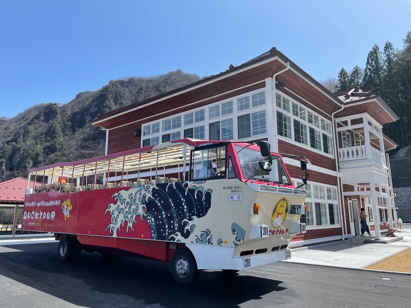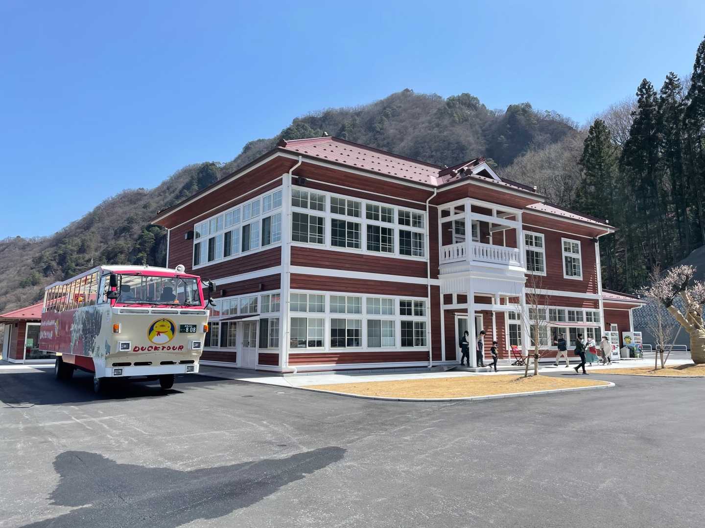 ダム湖には旧長野原町役場を模した事務所が完成、春まで運休中の水陸両用車が停まってました