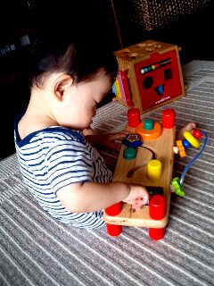 福岡に転勤した友達が遊びに来るというので仲間に声をかけてみんなで神戸でランチ座敷のあるお店を予約しておいたので羽根くんも参加してきました。駅から近く、また雰囲気も悪くはなかったのですが、思ったより座敷が狭かった。。。その上初対面の三十路’Sに圧倒されたのか羽根くん終始グズりっぱなしほとんどママ抱っこで、何食べたかよく覚えてないでも久々に5人全員集合でワイワイと楽しかったです帰りの電車の中ですぐ横にいたベビーカーの男の子が羽根くんに話しかけてきて羽根くんも途中から身を乗り出して会話羽根くんより2ヶ月上の子だそうででも子供同士、何話してたんだろうね昨日はモール内のGAPで5~6歳のお兄ちゃんが空手風に手足を動かして遊んでるのを見て羽根くん何やらツボだったらしく、声をあげて大笑い。それ見てお兄ちゃんも何度も手足を動かして羽根くんを笑わせてくれました。子供同士って面白いね。今日は1日雨降りでお出かけできなかった羽根くん。誕生日のプレゼント等で遊んでました。メイシーちゃんはどこにいるかな?トンカチ無しでも遊べるよ上手に遊べなかった↓もこっそり車をレーンに乗せようとチャレンジしていてうまく走らせることができたときにはパパとママの方を見て「出来たよ!」とアピール。「すごいすごい!」と拍手して褒めちぎると羽根くん嬉しそうにまた何度もチャレンジしています。そしてピアノ。ピアニストへの道は遠い…