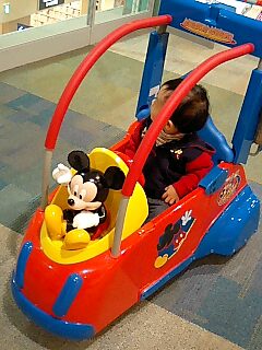 天気も悪く寒いので「イオン大○」へ行ってみました。ここの子供用カートはキャラクターが選べる!ウルトラマンにドラえもん、アンパンマン、ピカチュウ、ミッキー…「どれがいい?」と羽根くんに聞いたらミッキーマウスに乗り込みました。多分一番近くにあったからだと思うけどね^^ハンドル回して大喜び♪…でも途中で何度も立ち上がった「イオン」はとにかく広い!「マイ○ル」なんて目じゃない!最近のこの手のショッピングセンターは広いねぇ。でも子供服のお店は少なかった…。買っちゃったけどやっと席を確保したフードコートでランチタイム。でも羽根くんは近くの乗り物コーナーが気になってが仕方ない。食欲旺盛な羽根くんが食事もそっちのけ。「メリーゴーランドに乗りたい!」と(多分)訴えてましたが、カートに乗せたらもう忘れたみたいです(笑)ちなみに帰るときカートを返そうとしたら若いパパが「コレいいですか?」と言って来られたので引継いだら、そのパパ、携帯で「今ミッキーのGETしたで」って連絡してました。よっぽどミッキーのに乗りたかった(乗せたかった)んだろうなぁ。