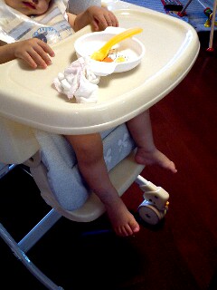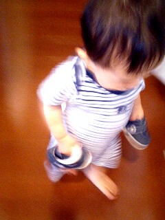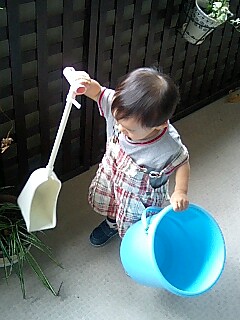 ベランダで洗濯物を干してるママをいつも部屋から恨めしそうに見てる羽根くん。最近はくっく(靴)を履かせてママの監視の下、ベランダで遊ばせることも。(オール壁面なので隙間から落ちる心配も無いし)ベランダには目新しい物がいっぱい!最近の羽根くんのマイブームはナイナイ(お片づけ)。スイミングで、浮いてるボールを籠にナイナイする遊びがすごく気に入ったみたいでそれ以来「ナイナイして」と言うとおもちゃでも何でも「ナイナ~イ」と言いながら箱に入れるようになった。もちろん本人はお片づけしてる意識はないベランダ用スリッパも植木鉢にナイナイされてました・・・(手前はちりとりを持つ羽根くんの手)ついでにお掃除しといてねそれからもうひとつのマイブームがイ~タ!(いただきます)食事の前に手を合わせて「いただきます」を教えたら‘コレをしたら食べ物にありつける’とインプットされたらしく「イ~タ!イ~タ!」とうるさいうるさい(笑)羽根くん、この「イ~タ」がよほど気に入ったのか、汽車ぽっぽを壁にぶつけて「イ~タ!」寝る前ベッドの上で突然手を合わせて「イ~タ!」先日はお風呂場で洗面器にお風呂おもちゃを詰め込んで運んで行ってお座りして「イ~タ!」一体何を食べてるんだろう・・・(笑)