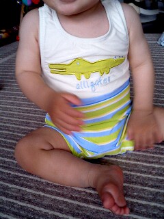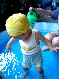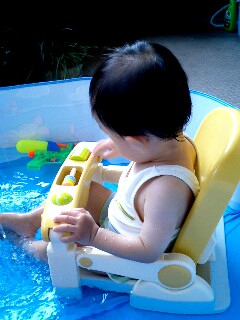 週末にベランダ用のビニールプールを買ってきました色々迷ったのですが、空気を入れなくてもいいタイプのにしました。(安かったしね☆)すぐに準備できて便利なのですが、子供が淵に手をかけると水がドバ~ッと出てしまうのが難点。一人でたっちできない子だと使えないかも。。。以前、保育園での水遊びの際には「ママァ~」と泣きべそかいてくっついてた羽根くん。ベランダプールも最初はパパにつかまっていたのですが、ママが一緒に入って遊んでる内に・・・一人でたっちできたよ良かった~これもスイミング効果かな?しゃがむのもへっちゃら!?(少々へっぴり腰ですが)水遊びする息子の姿を初めて見たパパは写真撮りまくり、ビデオ回しまくりでした(笑)。さて、今日のスイミング。羽根くんもかなり慣れたようでプールの淵に一人で腰掛けて座れるようになり、浮いてるボールをカゴにナイナイするのも上手に出来たし、天井を指差して「あっ」「あっ」を連呼。笑顔も出る余裕。特にバタ足が好きみたい。さらにインストラクターさんが見本を見せる際に「ちょっと羽根くんお借りします~」と連れていって「高い高い」をされたけど平気でした!羽根くんが水遊びを好きになってくれて良かった~。