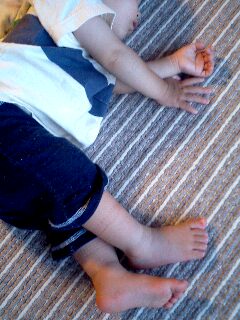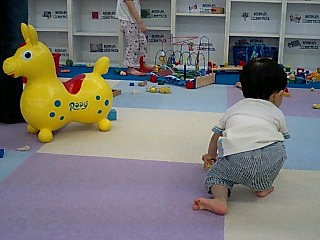 ちょっと久々の更新になっちゃいました市主催の育児教室と、保育園の育児教室に連チャンで参加。市主催の方は4ヶ月~1歳半までが対象で梅雨時にも関わらず40組近くの親子が参加していてホール内は湿気と熱気でむせ返ってましたいつの間にか羽根くんは一番大きい子のグループになっていてしかも徘徊しっぱなし小さい子の輪の中に入って行こうとするのでママ目が離せない羽根くんがまだ小さい子グループだったときにあんよ出来る子が乱入してきてお母さんが慌てて連れ戻しに来てたけどあぁ羽根くんと私も今そんな風に映ってるんだなぁ。こういう育児教室は他の子を見るいい機会でもあり、集団の中での我が子を見るいい機会でもありますあんよしてる子がまだ少ない、というのもあるんだろうけど羽根くんの徘徊ぶりが目立ってる~ママのそばでおもちゃで遊んでる子が多い中、羽根くんは相変わらずおもちゃを投げて転がしながら徘徊。みんなで手遊び歌しても終わると速攻徘徊開始。ボールプールはやっぱり苦手みたいですぐに脱出してまた徘徊。絵本の読み聞かせのとき、絵本の目の前まで行っておとなしく見てるな~と思ってたら羽根くんの視線がふっとそれた!視線の先には・・・さっきまで閉まっていたホールの扉が開いてるではないか!ヤバイ!!案の定、絵本そっちのけで扉に向かって突進していく羽根くん。しかし羽根くんの行動を先読みしていたママが脱走を阻止!「よく解ったねぇ」とみんなに褒められました。あぁ私、この子の親なんだなぁとしみじみ実感。。。徘徊しすぎて疲れちゃったね ママもね…