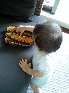 羽根くん、1才3ヶ月になりました。この1ヶ月で変わったかな?と思われるのは・・・体重9.1kg 身長76cm ちょっとだけ大きくなったかな?やっと9kg台に乗った模様。パパのグローブ いつかキャッチボールするんだいそして大好きなのがあんよでの散歩靴を持って来て催促し、嬉しそうに飛び出して行きます。間近で見る電車に大喜び それからやはり大好きなのがママのお腹・・・寝かしつけは必ずママの添い腹(苦笑)お腹を見せると嬉しそうに飛びついてきてなでたり、抱きついたり、顔をくっつけたり、噛んだり、踏んだり、飛び乗ったり。痛い・・・そしてママのお腹の上で大の字になって寝る。夜中も怖い夢見たのかワーワー泣いて転がってきてママの服をめくってお腹にくっついた途端、ピタリと泣き止んで寝てしまう。恐るべしママの腹!!お腹の中にいた頃を思い出すのかな?最近は部屋の中に飾ってある家族写真を見て「パパ、パパ」と連呼。この姿にパパは完全にKO負け。メロメロになってました。
