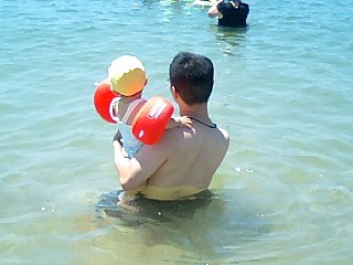 海水浴に行ってきました白浜や日本海はちょっと遠いし、かと言って大阪湾や須磨はあまり綺麗じゃなさそうだし、で、行ってきたのは和歌山県にある片男波海水浴場以前、パパとママが潮干狩りに行ったことのある場所です。大阪からだと高速使って1時間半ほど。それに意外にすいてました。途中でビーチパラソルを買おうと思ったのですが、UVカット付きサンシェード(いわば屋根付きシート)に変更。これが買って正解!この日は今夏一番の暑さ!日よけがないと耐えられませーんさてさて。羽根くん、今日が初めての海水浴浜辺に着くと心なしか羽根くんウキウキしている様子。ヤケドしそうな熱さなので砂には降ろせなかったけど水着に着替えて、いざ海へ!スイミングで使ってる腕浮き輪も忘れずに(笑)初めての海はどうですか?波打ち際だと波の音が怖いみたい。海に入ったら笑顔も出てました広いねぇ 気持ちいいねぇそれから3人でお弁当羽根くんモリモリ離乳食食べてました。お外で食べると美味しいね今度はママとママの水着姿はあまりにセクシーすぎる!?ので今回は無し(笑)あまりの暑さにパパママも疲れてきたので1時間半ほど滞在して引き上げることに。羽根くんも疲れちゃうしね。それでも十分楽しめましたちなみにこの海水浴場、駐車場は結構たくさんある方かな?駐車場の目の前が海なので、移動がラク。シャワーは1回¥100で、更衣室ロッカーもあります。ただし決して綺麗とは言えませんが。海は綺麗でした。