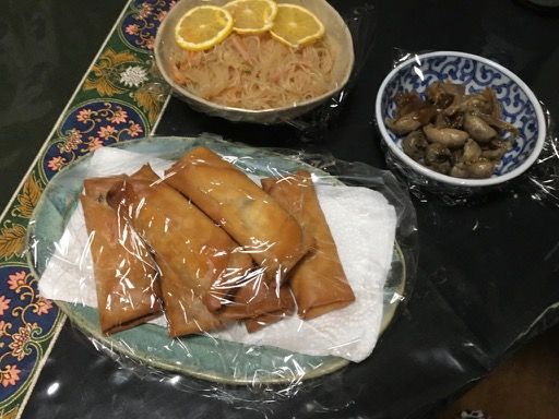 昨日ハガキを配ってしまったので予報通りの土砂降りの中出て行かなくても良く予定では午後からの勉強午前中にやってしまおう!と孫をその気にさせて課題に取り組みおばぁちゃんの所には雨の様子を見て10時過ぎに顔出しに仏様とおばぁちゃん、義弟に挨拶をして急いで出たけれど時すでに遅くまたまた雨脚が強くなって来ていて大急ぎで戻りました夕方義兄から夫に電話でうちの舟がひっくり返って居ると言われ明日直しに行く事に!孫は土曜と気付かず?午後もまたひと勉強し夕飯春巻きにするから中華サラダ作ってね!と頼んでおくとちゃんと作ってくれました本家にお届け分うなぎの肝煮は孫のおとーさんが届けてくれたものをお裾分け!大磯に住む夫の大学時代の友人から夕方届いた湘南ゴールドを添えて春雨サラダとても美味しく出来ていました〜