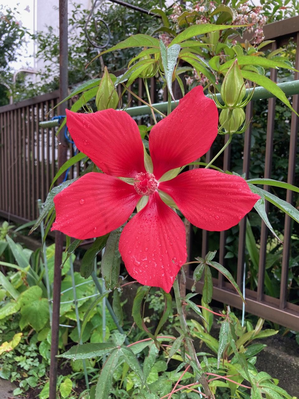 今朝起きた時には降っていなかった雨が5時過ぎると降り出しましたゴミ出しをするために外に出ると今日は咲くかな?と思っていた紅蜀葵(通称モミジ葵)が初咲きおばぁちゃんがディに行く時に雨は止んでいましたやっぱり持っているよおばぁちゃん!午後は次男夫妻と孫4が出て来ていくらも経たないうちに長男と孫5、6が出て来て賑やかに遊んでいます孫4、5が明日もここで会う約束をして夕方皆それぞれ引き上げて行きました数日前にマンションの前の道路にいて危うく夫に踏みつけられそうになった蛇外壁を上って行ったけれどその後どうなったかな?うちまで来てくれればモグラがいるのですがね〜!