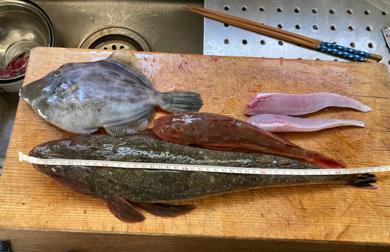 ひさびさの大漁〜!!!家に居ながらにして・・・漁師をしている従兄弟から電話が入り小さいけどマゴチって食べられる?勿論「食べられるよ〜!」と返事をするあとで届けるというのでりんごを煮たりしていると嫁さんがバイクで届けに来てくれたマゴチやメゴチは卸せない人がいるので聞いてくれたらしい見ると大きい〜!!!骨や頭は潮汁にして捨てるところないよ〜!というとよかった!と嬉しそうな顔をしてくれる早速小ぶりな方のマゴチを三枚におろした所で写真!!!大きい方は46センチもありカワハギは26センチ強で肝パンホウボウも刺身用に卸しておき明日皆で戴こう