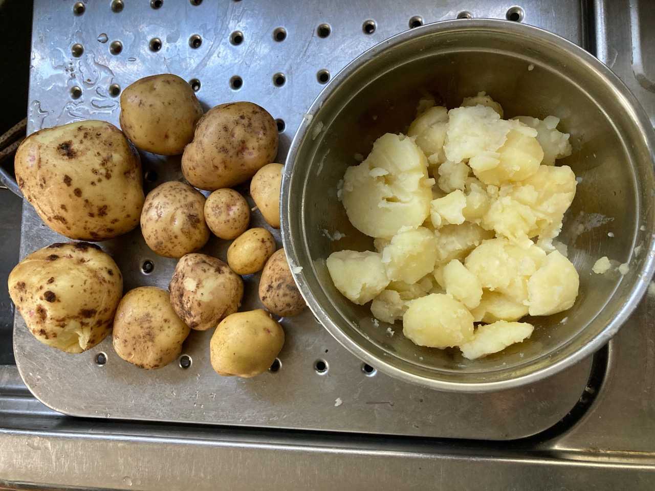 今朝ゴミ出しから戻り霜でやられた?ジャガイモがクッタリしているので掘り出して見たなんともビッックリ〜〜〜たった1本目こぼししたジャガイモからこ〜んなに沢山出て来たキタアカリまさか二つ三つかと思い浅めに掘ったら下から出て来る出て来る!傷つけてしまったものは早速茹でてポテトサラダにする事に!地の神様にすっかりお世話になりました偉いね〜ぇ