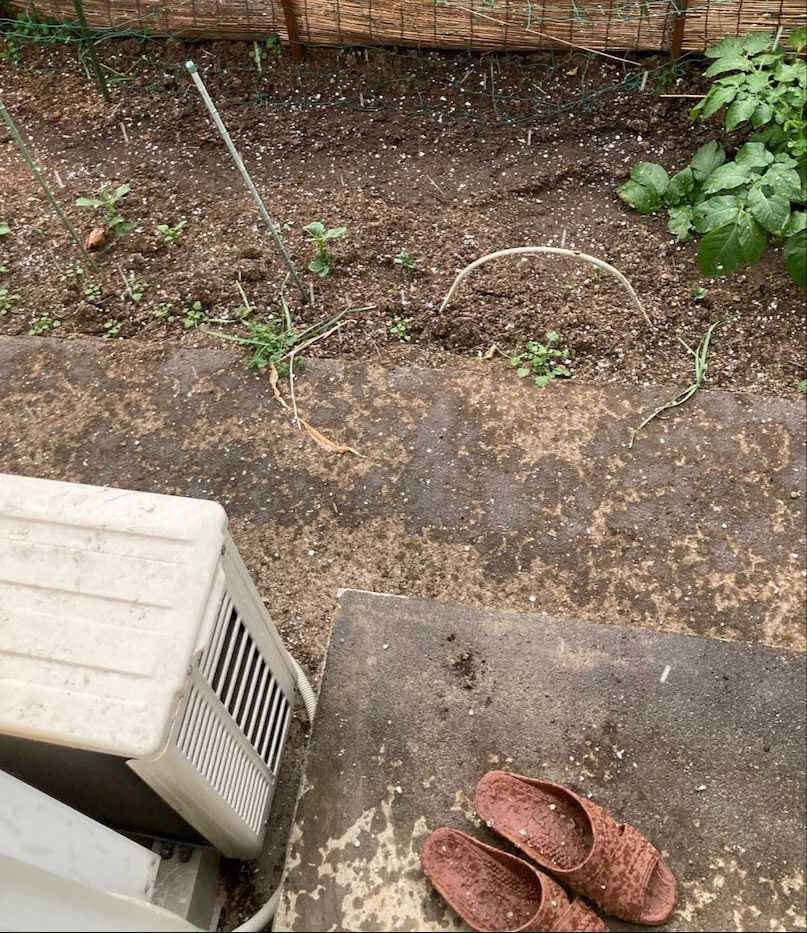 今朝は早朝にはもう雨が降っていた形跡があり洗濯を始めていくらもしないうちにまた降り出すあ〜らら!今日は部屋干しにしないと・・・今日も何があるかわからないので小雨降る中ハガキ配りに回り帰ってくる午後になり明るくなって来たと思ったらそのうち日が差す時間も!庭にとっては程よい雨でソラマメも芽が出始める