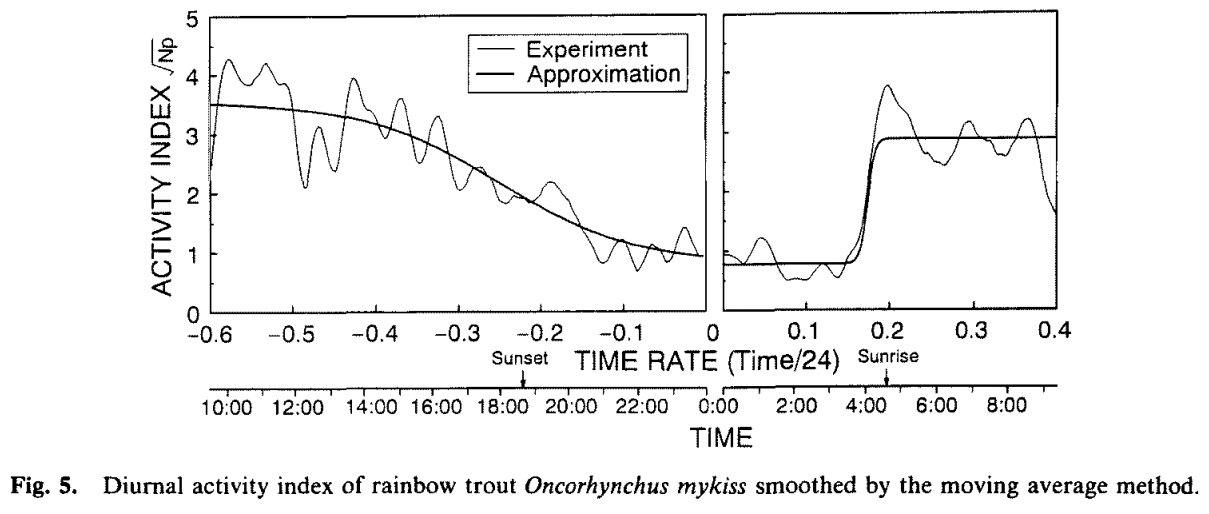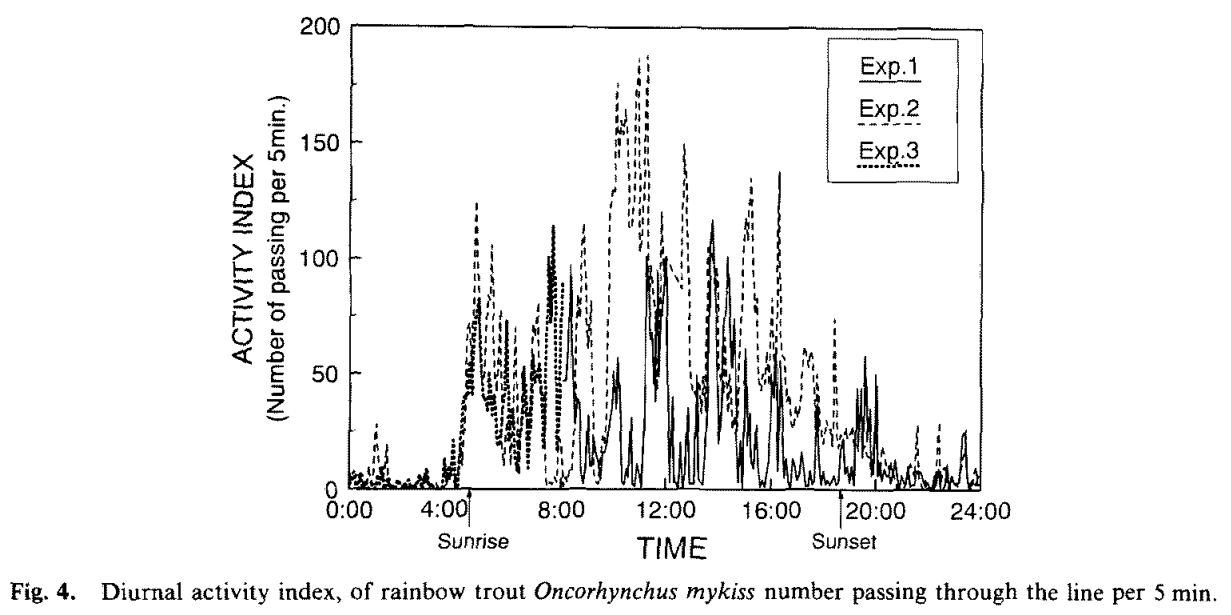 引用:水槽実験におけるニジマス日周活動と照度の刺網漁獲に及ぼす影響 藤森 康澄、東海 正、松田 皎 Nippon Suisan Gakkaishi 60(5),577-583(1994) J-STAGE
