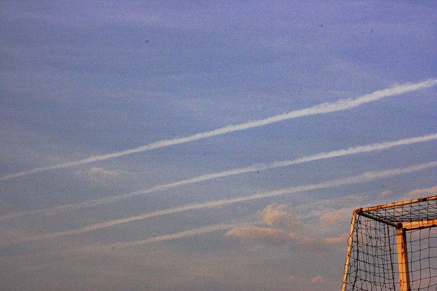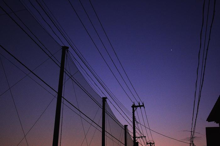 『空の青を少しだけおすそ分けしてもらって、 今日、も、息を、 ゆーっくり吸った。 満たされる世界の匂いが、 ぎゅーっと体の中で伸びた。 腕時計をつけると、 いつも時間を気にしてしまうから、 今だけは、 ぷらり外してしまったよ。 ぶらりゆるり。くるりのんびり。 閉じこもった空間ばかりにいると、 やっぱり息が詰まっちゃうね。 ぶらりゆるり。くるりのんびり。 大きく広がる世界に飛び出せば、 呼吸も伸び伸び飛んでいくよ。 届くはずない。 思い込めば、本当に届きはしないから、 届くはずなくても、 届け、と、願い、また息を吸うんだ。 ほら、深呼吸してから、 もう一度、 手を伸ばしてみ? 気持ち近づけた気しないか? 途切れかけた飛行機雲を、指でゆっくりなぞったら、 その続きも描けそうな気がした。 キミならどこまで繋ぐ? ボクは決めていないけれど、 思うまま、心のままに描いてみたい。 模範解答だらけの世界なら、 いつかはきっと疲れちゃうだろうな。 自由を履き違えるのは問題外だけど、 時には全てを忘れて、世界に浸ってもいいのかも。 ぶらりゆるり。くるりのんびり。 満たされた世界なのに、そのスープを受け入れないで、 今日も新たな味を求めるヒト。 ぶらりゆるり。くるりのんびり。 新世界も理想郷もそんなものなんてどこにもない。 あるのはいつもの世界だけ。 ほろりぽろり。ぽろりほろり。 心の根元から生まれた涙はきっと、 イマの世界を覗くレンズを治してくれる。 そう。 嘆いたヒトはいつもぼやけた世界を覗いてた。 今まで見えてなかった世界が見えたからって、 それを新世界とかって言うんじゃない。 今まで見えていたのに、見てこなかった。 拭うことなんてしなくていい。 強がらなくてもいい。 ぶらりゆるり。くるりのんびり。 時には力を抜いて、 ぶらりゆるり。くるりのんびり。 理想郷はここにはないけれど、 それでも、僕らは今日も世界を築くんだ。 ぶらりゆるり。くるりのんびり。 強がる自分に伝えるメッセージ。 ぶらりゆるり。くるりのんびり。 強がり無理しそうになった時には、そっと口ずさもう。 ぶらりゆるり。くるりのんびり。』久しぶりにカメラを使った。今月になって…2度目かな?少し前なら、夕焼けが綺麗そうだなぁ…と、思ったら、カメラを持って、自転車で写真を撮りに行ったものだが、今はしなくなった。余裕のなさ?わからないけれど、確実に風景を眺めることが少なくなったことは確か。アパートと大学。いつも決まった道を通る。その途中で、グラウンドのそばを通るんだけれど、そこから見える夕焼けは、いつもいつも綺麗だった。開けた視界から飛び込んでくる。何も邪魔しない。夕暮れがそのまま、焼きつかせる。今日も終わり。また明日。そんな気持ちにさせてくれる。だから、雨の日とかは、そんな気持ちにさせてくれないから、時々、今日と言う日に未練を残してしまいそうになるかも…なんて。金曜日、いつもと同じように、その道を通って、いつもと同じように、何もなく帰ろうとした。その日もそろそろ、空が夕焼け色になりそうな時だった。でも、いつもと違うのは、少し時間が早くて、あまり濃くなかったこと。だから、あまり空に気を留めることなく、ペダルを踏んだ。色々な考え事。自転車に乗ると、色々な考え事をしてしまう。いいこと、わるいこと。なんでもかんでも。忘れてしまいそうなことも、なぜか思い出してしまいそうになって、ぎゅっと強く握り締める。今回も例に漏れなく、あまり考えたくもないことを、考えてしまい…、ダメだと思って、おもむろに空を見上げた。飛行機雲。4本のラインの飛行機雲が空から空へと伸びていた。真夏の青の背景も、その色に負けないように伸びていく力強い白さも、見上げた空にはなかった。夕暮れに近い、淡い何とも言えない空の色に、これまた淡く、白に少し何か色味が混じった飛行機雲、そんな景色しかなかった。けれど、そんな景色が僕の心を留めた。あぁ綺麗だなぁ。気づけば、自転車を止めて、見上げたままつぶやいてしまっていた。周りには人もいない。あるのは、僕の呼吸と、昼間とも夕暮れとも言えないそんな曖昧な空間。僕はもう一度自転車に乗って、急いで家に戻った。そして、着くなりカメラを持ち出して、またさっきの場所に戻った。パシャッ。久々に聞く音。空を撮って、気づく。入学してからもう数え切れないくらいここを往復しているのに、ここで、カメラをいじったのは、初めてだな。って。意識しないようにしても、もう卒業のことを考えてしまう時がある。まだ1年あるけれど、1年なんて、あっという間だ。これから色々とあればなおさら1年なんて、あっという間に過ぎ去っていくだろう。それはもう9月半ば、あともう少しで後期が始まることからもわかる。そう思うと、その場で、景色を切り取っていることが、とても貴重なものだと思えた。数え切れないくらい往復したそんな見慣れてしまった道の