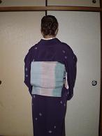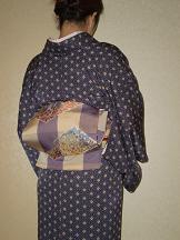 前回は「しばらく単衣」なんて書いたにもかかわらず、秋雨前線のお陰か、はたまた台風の影響か、雨がポチポチと降るため、つい先日まで28℃くらいはあったはずの気温が、ここにきてグッと25℃前後まで下がってきた。数字にすれば2~3℃と、全然大したことなさそうな感じがするけれど、決してそんなことはないのであるよ。だから、地球温暖化って、ものすごく大変なことなのだ。話はそれてしまったけれど、そんなこんなで、いよいよ袷を着てみちゃおっかな~なんて気になったので、ひとまず試着。まあ、袷といっても薄い生地やごっついのまで色々とあるけど、今回汗をかいたら「やっぱり単衣だ~」と後退するのを避けるために、ここはひとつ薄手で・・・ アンティークとまではいかないまでも、なんだか古き良き時代を思わせるような・・・そんな雰囲気しないですか~?今、このへんじゃあ、朝の番組で『あかんたれ』の再放送をやってます。むか~し、子供の頃に、母が見ていたのを一緒に見た記憶があるけど、内容までは覚えてないです・・・さすがの私も・・・ねえ。今の放送も見てはないですけど、志垣太郎さんが出演しています・・あたり前ですが、すっごく若いです。このドラマに出てくる『ごりょんさん』や『いとはん』の衣装はもちろん着物。思い切り柄の着物に、これまた思い切り柄の帯を合わせるという、その時代を映し出すコーデがとてもかわいいのです。そういえば、この当時は昼ドラで『ぬかるみの女(ひと)』もあったな~。そんなこともチラリと脳裏をかすめるためか、なんだか最近こんな雰囲気の着物に心惹かれております。コテコテのアンティークもかわいいけど、以前呉服屋でレトロな柄の着物を試着した時に、まさに「嫁に行き遅れた華族のお嬢様風」になってしまったので、ちょっと私にはもう無理だな・・・残念。さてさて、この着物はすっごく柔らかくて軽いし、密かに地模様がとってもステキなんですよ~。ちょっとわかりづらいですけど・・・ 全然わからないですね~。私にしては珍しいはっきりした濃い紫色。欲しいとは思っていても、粋になりすぎるので、なかなか手を出せなかったんです。帯は何年か前に「コレで角出しをしたい」と思って購入したものですが、普通に一回ギュッと結んで角出しにすると、思った通りに長さが足りないので、結ばない方法で適当にやっちゃってます。帯自体に厚みがあるので、普通にボリュームが出せたかな。いつもなら、着付けをしたあとの写真撮影でゴソゴソしてる間に、じと~っと汗が滲んでくるけど、やはり今日は涼しいわ。明日は本当に雨が降るらしいけど、明後日のお出かけに着物を着たいので、この涼しさをキープしたまま、なんとか曇りで踏ん張って欲しいところ。