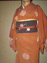 う~、またまた久しぶりの更新になってしまった・・・なんだかんだと、今年度はいろいろな役員が重なってしまったので、新年度に入ったばかりのこの時期は忙しかったりするわけで・・・なんてのは言い訳にすぎませんが、ぼちぼちと更新していきま~す。さてと、そんな毎日を送ってはおりますが、週に一度の着付け教室は、きっちりと続けております。仕事が終わって、あまり時間もないのに、昨日は着物を着ていきました。とりあえず自宅では着付け優先にして、昼食は車の中でモグモグと食べて、なんとか空腹を誤魔化すことに成功。教室に行くと、先生は二人、生徒も二人という、きっととてもラッキーな状態なので、しっかりと教わることが出来るし、やっぱり先生がとても素敵なので、毎回刺激されております。その週のレッスンが終わって帰宅すると、もちろん着物などはいったん干してからの片付けになるわけですが、それとほぼ同時に来週のためのコーデが始まるわけで・・・最近、タンスの中を整理して、かなりの枚数の着物と帯を処分、というか人にあげることにしました。そのお陰で、引き出しの動きがとってもスムーズ。桐の三段引き出しチェストの上に山積みになっていたものも約半分にまで減って、上からの圧力がなくなったせいなのでしょうね~。その引き出しの中は・・・やっぱりどれも秋色のものばかり。それでも、数少ない白っぽいものは、あまりにも寸足らずで、教室での練習とはいえ、ちょっと・・・と気後れしてしまいそうだし・・・という状況の中、昨日の着物はコレ。ちょっと美味しそうな柿色によろけ縞の入った紬。そして帯は、真夏以外は季節を問わず使える格子の名古屋帯。ああ~、小物まで秋色が多くて、これが精一杯です~。昨日は名古屋帯の結び方を習いました。初めて前結びというものをしましたが、確かにとっても楽でした。今回は敢えて全通の帯を使ったけど、この方法だとポイント柄でもイメージどおりに柄が出せるわ~。まだ一つ一つを確認しながらやってるので、結構時間はかかるけど、久しぶりに練習して、早くパパパッとできるようになったら、こりゃあいいわ~。