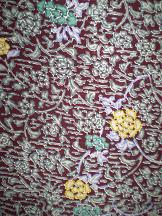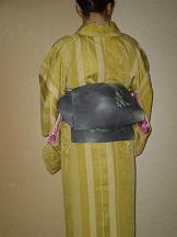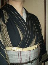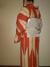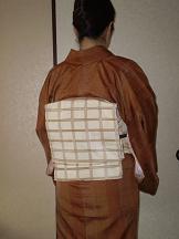涼しくなって、俄然やる気になってきた私。先日、チラッと見た時から気になる帯がありまして、ものすご~く安かったのに、数日間考えて結局ゲットしました。いやあ、これ以上タンスに入らないから、できるだけセーブしないと・・・でも、色がよかったんですよね、私、この色に弱いんです。今の帯では、なかなか見つけられない色合い・・・だと思います。花は薔薇で、葉と茎は金色ですね~。この程度の金なら、紬にも使えるよと聞いたので、いけるかなと決めちゃいました。そこで、ちょっと挑戦。これも、ずっと気になりつつゲットした着物。ただ、どう着こなしてよいかわからず、ずっとタンスで寝かしていました。着物は細い黒の縞が入っていて、胴裏が真っ赤っか、八掛が黒というカッコイイ感じです。きっと昔の着物を仕立て替えしたのか、寸法もそこそこあるし、しつけ糸も付いたままです。ただね~、キャ~って飛びついたはいいけど、これまでの私とは全然ジャンルが違うので、何をどう合わせたらいいのか、皆目検討がつかなかったんです。そこへ来て、今回の帯に出会い、もしやこれなら・・・と思ってみましたが、どうなんでしょうか・・・?やはり、わからない。もう一つの案はこんな感じ。やれやれ・・・とちょっと傾いてますけど、気にせずにどーぞ。あああ~、やはりよくわからないわ~。半襟やら帯〆なんかの小物が入ると、また違ってくるんでしょうが、今のところはこれが精一杯です。お店では黒い帯と合わせてトルソーに着せてたんだけど、残念ながら帯はゲットならずで・・・以来、黒でピッタリ来る帯を探してはいるのですが・・・逃がした魚は泳いでる・・・もとい、大きかった!!さて、ここで、先日の茶色の大島ですが、柄がよ~くわかるようにアップで写真を撮ってみました。角度や光りの当たり具合で茶色が濃くなったり白っぽく写ったりとするので、フラッシュなしで撮ってみましたが、やはり実際にはもう少し濃いかな。 意外とプリティでしょ?まあ、とりあえずは、こんなところで・・・