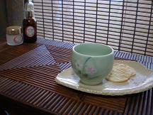 久々に『まつげパーマ』のお客様がいらっしゃいました。ご近所の方で、うちのお嬢さんのクラスメイトのお母様です。本音をいえば、こちらからお邪魔する方が楽チンなのですが、諸事情でうちですることになりまして・・・朝食後は、リビングの荷物を大移動させ、掃除機をかけまくり、アチコチの扉を閉めてまわったら準備はほぼ終了。まつげパーマの場合は、使用物品も少なくて助かりますが、久しぶりに我が家にゲストを迎えるので、そりゃもう必死で掃除しましたわ。もちろん施術はスムーズに終了です。私、重箱のスミをつつくのが好きなせいか、ごつい手の割に手先が器用で、細かい作業も難なくこなしてしまうので、自分でもこの仕事が向いてると思っております。ナースとしてだと、注射をするのが難しそうな血管を見ると燃える・・・こんなところです。お客様には少しゆっくりしていただきますが、今回用意したのはこちら。 ポーセラーツ教室で作成した皿と、湯飲みの中味は『唐辛子こぶ茶』です。この時点では、もう飲み干した後なので、空っぽになってますけど・・・湯飲みもペアだとサマになったのでしょうが、皿しか作成しなかったので、仕方なくあるもので勘弁して~。でも黙ってたらわかんないし・・・いいよね~。