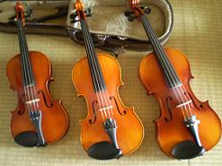 我が家には、全部ではないですけど、3サイズのヴァイオリンがあります。それというのも、私以外にも二人の若者が習っているから。最初は、私が習いたいばかりに始めたヴァイオリンですが、どうせいずれは彼らにも音楽を習わせようと思っていたし、わざわざピアノのレッスンに連れていくのは二度手間で面倒くさい・・・(ここですでに手抜き)、しかし何といっても最大の理由は、そんなに広くない我が家には、もはや空いている壁がなかったのである!!つまり、ピアノ(もしくはキーボード)を置くスペースなど、どこにもな~い!!まあ、最初は音符も読めないちっちゃい子に、いきなり音を出せというのも「う~ん」と考えました。ピアノは、鍵盤を押せば正しい音が出るけど、ヴァイオリンはそうはいかない。別にプロにしようなんて思ってないけどさ~。と思いつつ始めたレッスンですが、早いもので8年・・・かな?私は途中お休みしていた時期がありましたが、彼らは優しい先生と厳しい親のもと、いい加減な練習ではありましたが、何とかここまできた。左から1/2、3/4(下の子用)、4/4(上の子用)というサイズです。読み方は2分の1とか、分数と同じように読みます。間違っても1月2日とかではありません(それはないだろ~)もう一つ、私の4/4がありますが、入りきらなかったので・・・安物だし・・・この中の1/2が、この度、我が家から旅立つことになりました。うちでの役目を終え、もう何年も使われることなく、埃をかぶるだけでした。とりあえず、2年後くらいの引き取り手は決まっていたのですが、それまでは戸棚の片隅で放ったらかし状態が続くはずでした。それが!!なんですか、もう終わってしまいましたが、山ピーが出ていた「ブザービート」にヴァイオリンを弾くお姉さんがいたんでしたっけ?それを見た友達の子供が「僕もやりたい」と言ったんだそうな!!でも、親としては続くかどうかわからないものに、いきなり高価な楽器を買うのはちょっと・・・ということで、それじゃあうちのが空いてるから、貸してあげるよ~てなことで、とりあえず貸し出しが決まりました。まあね、そういうことなら記念写真でも・・・と、ちょっと並べてみたわけですが・・・なんだか、セレブな感じがしません?下が畳なのは別にして・・・フフフ。気分がいいので、ちょっとやってしまいました。 ホホホ。弾いてないですよ、弾いてるフリです。一応、着物は会津木綿、帯は『いりこさん』作の木綿の作り帯です。ポップな柄が気に入ってる帯です。木綿の着物って、一度合わせたら滑らないから着付けも楽だし、汚れも気にしないでいいから好きなんだけど、いつもリサイクル着物を調達してる私には、やはり高価なモノ。でも、着なくちゃ意味ないから、たまには着なくちゃ~。