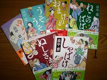最近、ブログの更新が滞っております。気分が乗らない・・・これが一番の理由かと自分では思いますが、ではかといって着物と一切かかわっていないかといえば、それも違う。夏だったか、いや、梅雨の時期だったか、のみちさんに本をお借りしておりました。もちろん、私のリクエストによって、そのほとんどがマンガではありましたが・・・その中に、これまたリクエストでこんな本が入っていました。ご存じの方も多いかと思いますが『しゃばけ』シリーズです。左上の『ゆめつげ』だけは違いますけど。じつは、マンガはアッという間に読み終えてしまっていましたが、自分が希望したというのに、この本だけは手付かずの状態でした。・・・ごめんね~、のみちさん。ところが、先月中頃に急に思い立って、やっと一冊目を手に取り、後はあれよあれよと読み進め、一月もしないうちに読み終えてしまいました。やったわ~、のみちさ~ん。そりゃあもう、仕事の休憩時間や、料理の合間だったり。ちょっとでも手が空くとついっと本を取り、その世界にぐぐっと入り込む・・・こんな感じです。そうそう、若かりし頃の私は、読書が好きな文学少女だったわ(マンガも含む)久しぶりに活字を読み、何となく満足。それにこれ、時代物なんですよね~。ちょっと難しい漢字の読み方が出たりしますが、まさに『和』です。そして、テレビドラマでも、時代物といっていいものかどうかわかりませんが、TBSの『JIN』がおもしろい。多少なりとも医療の知識を持っているのもあって、内容もおもしろいし、まるまる『和』の世界なので、目で見るのも楽しい。こんなわけで、毎週欠かさず見ています。なのに、現実の自分は、今月に入ってまともに着物を着てもいない。これではいかん。先日習った着付けを、モデルがいないので仕方なく自装で復習しようと、これこそホントにちょっと着てみました。帯を後ろで折って、もう一回折って、さらに折ってという作業は、さすがに慣れないと肩と腕が疲れるばかりでしたが、出来上がりはいつもよりもビシッと決まりました。今回の着物は、私が無意識のうちに集めた『秋色』シリーズ。アップにすると、薔薇の模様がわかります?そんなにいい着物ではないと思いますが、『薔薇』に心引かれて、ついつい買ってしまったものです。が、練習用にはピッタリ。もうずいぶん前に買ったまま、これまたタンスの肥やしになりかけていたものを引っぱり出してみました。ほかにも肥やしになりかけがあるので、どんどん着なくちゃ~。