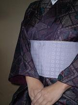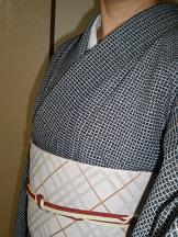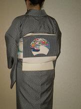 先日、タンスの中をごそごそとしていた時に、こんなものを発見した。帯です。名古屋帯。パッと見た目には、黒地に見えますが、どうなんだろ・・・黒じゃないような・・・そして、これまた写真では模様は白に見えますが、柄が入っているウロコ部分はシルバーなんです。あ~、そういえば、あったあった~!いつも地味系の紬などを着ているせいで、なかなか出番がないまま、いつのまにか忘れ去られていたちょっと可哀想な帯です。いえね、だって、これ、いつ締めたらよいの?じゃあ買うなよ・・・という声が聞こえてきそうですが、予想に反しての安値だったので、つい・・・まあ、いつものことです。さて、この一見豪華な名古屋帯は、何に合わせようか。どう見ても、やはり紬には不向き。かといって、いくら少しキラキラしてるからといっても、訪問着にも不向き。仕方ない、とっておきの小紋を・・・これまた、あるんじゃん!!という声が聞こえたりして・・・合わせるとこんな感じに・・・ どうせなら、もうちょっと丁寧に合わせればよいものを・・・着物はうす~いグレーですが、光沢があるのでシルバーといった方がよいかも。生地をアップにすると、何やら見えてくるものが・・・ 全体の地模様と、花に絞りが入ってるんです~。こちらは忘れることなく、大事に大事に仕舞っておいたのですが、大事にしすぎてしっかりとプレスされております。うんうん、何だか気合いを入れてのおでかけって感じがして、たまにはこんなのもいいではないの。・・・でも、これはどこへ着ていけばよいのだろうか・・・確かに『とっておき』なんだけど、また出番がないまま忘れ去られてしまいそう・・・