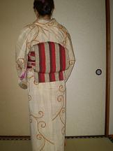 かねてより希望していた他装着付けのレッスンを、いよいよ開始することができました。どこぞの着付け教室に通って免状を取るという道もありましたが、そこまでの情熱はなく、ただどうせ着付けるなら、自分だけでなく人様にもそれなりに着付けができるといいな~と思ったわけでして・・・自分で着付けができると他装もできるという多少の自信がありましたが、以前母の留め袖を着付けた時に、思いの外時間がかかったのと、出来上がりに満足ができなかったのとで、いつかリベンジするためにも・・・といういきさつがあるのです。手近な公民館の教室なども考えましたが、時間などの条件があわず迷っているところへ、講師の免状を持つ知人から「知り合いだけでレッスンする」という情報を入手し、速効で「我も我も~」と、仲間に入れてもらいました。さて、となれば持ち物ですが・・・これの出番かな。 『や○と』の展示会でもらった着物バッグですが、見た目はスッキリとしていてお洒落ではあるけど、ファスナーを全開にしてもフラットにならないという欠点もあります。ずっと大事に片付けていたので、今日初めて気がつきました。開けるとこんな感じで、さすがにたくさん入ります。着物や襦袢などは、水玉模様のファスナー付き内袋に入れるように出来ているので、すっきりと使うことが出来ます。さて、レッスンですが・・・ トルソーや人体を使っての実践あるのみ!!ていう、でも知り合いばかりなので終始和やか~な、楽しいものでした。 持参したこの帯は、自分に締めると「なんだかな~」という結果になってしまいますが、レッスンではキレイに仕上がっています。今日習った締め方は帯を傷めないないので、もうちょっと練習して、ぜひ自装に取り入れたいものです。自分では着物を着たわけではないですが、久しぶりに着物仲間に会えて満足の一日でした。