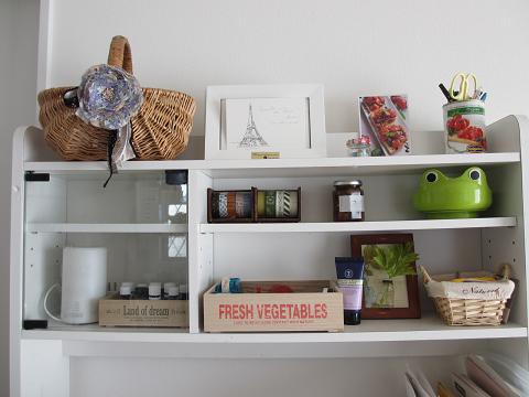 95%食べ物ばかりのブログなので、今日は別もので(^m^)今まで使ってた食器棚は夫婦二人の時はちょうどよかったけど子供ができて4人家族になるとどうしても食器が納まらない。今回の引越しで新しい家は収納が少ないので、これを機に大きめの食器棚を買いました。で、今まで使ってた食器棚は食材の収納や物入れに。そして上段の棚の部分は私の好きなものを置くことに(*^_^*)100均で見つけたマスキングテープの台。木の色と側面のデザインに一目ぼれ!2個を横に並べてるけど、スタッキングもできてなかなか使える!布コサージュは、先日のバザーで作ったもの。みんなそれぞれ自分用のコサージュを作って、バザー当日胸に付けました。けっこう気に入ってて、バザーだけではもったいので飾ってます(^^)リネン×パープルの小花柄、私の大好きな組み合わせ♪いつも使ってるトマト缶、ラベルが好きでこうやってペン立てに。あとマグネットクリップではさんで冷蔵庫にもくっつけてハサミや計算機、IKEAのクリップなんかの小物入れにしてます。これからもっともっとお気に入りが増えて、棚いっぱいにディスプレイできたらいいな♪