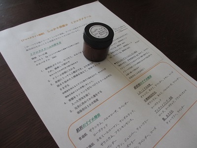 昨日はアロマ講座に行ってきました。今回は、前回のメンバー+先生のお友達が加わってまた楽しいひとときになりました。精油選びは本当に迷うぅぅA=´、`=)ゞ好みの香りを探しつつ、精油の効能も考えながらようやく出来上がった化粧水はローズウッド、ラベンダー、ローズマリーにネロリウォーターも少し加えて。もう1つのクレイパックにはフランキンセンスとゼラニウムを。早速その夜お風呂の中でクレイパックし、入浴後は化粧水を使いました(>▽<)いつも精油は芳香浴で使ってるから少し香ってるかな、ぐらいだけど、今回は顔につけるので精油の香りがダイレクト(☆o☆)お風呂上りはほっこり温まった体に、これらの香りで優雅な気分になり、本当にリラックスできました(*゚∇^*)ノ~