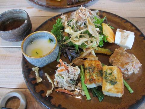 バザーの打ち上げで、先日ご紹介したスコーンのお店の姉妹店、これまたステキなお店に行ってきました♪メインはがんもか豆腐ハンバーグが選べ、私はハンバーグの方で。左から時計回りに、さつまいもの豆乳スープ、ごぼうチップ付サラダ、絹豆腐のゴマドレッシング?、鶏肉?、豆腐ハンバーグハーブガーリックソース?、おから。ランチにはデザートの豆乳ラテ?と黒ゴマアイス?すみません、おしゃべりに夢中で、メニューうる覚えで。。。(>_