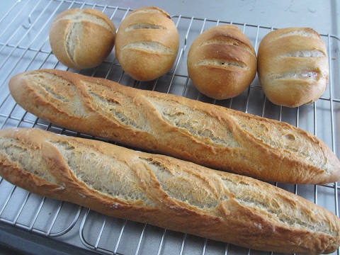 久々のパン日記です f  ̄. ̄*)ポリポリ昨日のランチに久しぶりバゲットを焼きました。そして同じ生地でベーコンとチーズも包んでみたり。一見無難に焼けたバゲットですが、実は2本のうちの片方はホイロが終わりオーブンシートに移す時、20センチくらいの高さからボテッと見事に落下させてしまった/( ̄ロ ̄;)\幸い床ではなくシートの上なのでセーフだったけど落下させるとホイロで膨らんだものがみるみるうちにシュワワワンッとしわくちゃに小さくしぼんでしまってヒェェェェー w(゚ロ゚;w(゚ロ゚)w;゚ロ゚)wで、でもここまできたら焼くしかないでしょ!しかし!焼きあがったらあら不思議(*゚Q゚*)しわの跡が残ってるものの(下のバゲットの右下)見てお分かりのようにもう片方より一回り大きく焼き上がりました!!(゚ロ゚屮)屮付け合せのスープにと、冷蔵庫のありあわせでミネストローネを作るつもりが汁けがなくてラタトゥイユかな(・・;)タマネギ、ニンジン、じゃがいも、ピーマン、セロリ、キャベツ、おくら、ブナピートマト缶、ニンニク、オレガノ、バジル、ローリエたっぷり野菜で体も元気になった、気がする(゚m゚*)角切りベーコンにチーズ、ブラックペッパー。辛いものがダメな旦那さんにはブラックペッパーなしで。「パパはお子ちゃまだからカレーが食べられないんだよ」ある日幼稚園の給食でカレーが出た時、ダニエルはクラスのお友達にそう言ったらしい。うかつに家で旦那さんをお子ちゃま扱いできませんなぁ(゚×゚*)今日は幼稚園の修了日、そしてその後大掃除があるのでこれから出かけてきます!