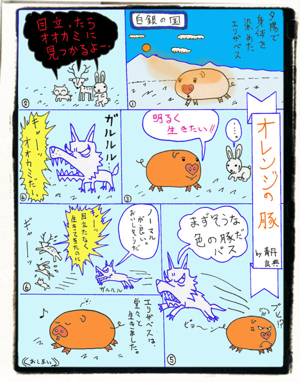 動物たちが夕日などの光で身体を染めるほのぼのした童話を考えたつもりが・・・・、何だか意味不明な落書きで終わりました。