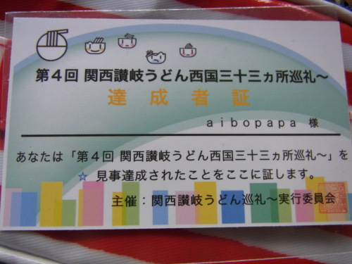 本日は 『第4回関西讃岐うどん西国33ヵ所巡礼』の達成者パーティーが 盛大に開かれました。が 拙者 仕事で欠席、 うぅぅぅぅ泪しかし 事前に 実行委員会から丁寧な お便りと 達成者証が送られてきとります。回を増すごとに どんどん盛大になっていく この巡礼、実行委員会の ご苦労は ものすごいと思います。拙者は ただ うまぁぁって言って 素敵な出会いに感謝してうどん すするだけですが・・・ほんとに 今回も お店の皆さま 実行委員会の皆様素晴らしい 企画を ありがとうございました。ランキング応援お願いします!ワンクリックお願いします