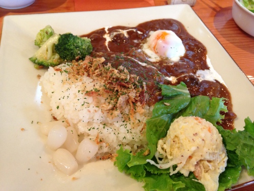 本日の昼飯代 これのみ750円なり!久々 昼のキッチンママさんで お昼のメニューの ひとつである本日は『特製デミグラスカレー』 初トライです。出てきた瞬間 濃厚な カレーの香りで 秒殺っす。ブロッコリーと ポテサラに らっきょ・・・ビジュアルも 見目麗しき カレーなのです。この絶品カレーと サラダと スープと ドリンクが付いて750円です。じっくり煮込まれている トロトロのカレー うまぁぁぁ!カレーを 半分食べたとこで満を持して? 温玉と カレーをミックスです、玉子と混ぜるとカレーが マイルドに なって またまた 違い うまぁぁぁです!反対のアングルからも 撮影っす!美しい 盛り付けだなぁぁ懐かしい写真はこちらランキング応援お願いします!ワンクリックお願いします