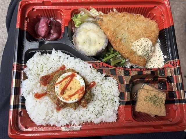 本日の昼飯代はアジフライ弁当のみ750円なり!本日は午後イチで京橋で仕事ゆえ、お気に入り居酒屋さんの花葵さんでお弁当🍱買ったど!遅かったけん、アジフライ弁当2個しか残っとらんかったとです。しかし、残りものには福がある!アジフライばらうまで大満足でーす!ご飯の上のは、キーマカレーでした。これまたうまぁ!
