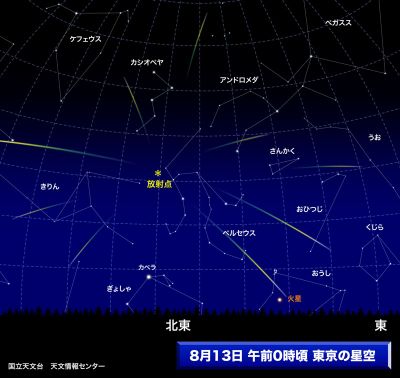 今年も、ペルセウス座流星群の見れる時期が来ました。今年は、お天気も良く、月も新月ということで、12日22時以降、翌朝未明までに極大を迎えました。 最も沢山見れるであろう日時は過ぎましたが、13、14日深夜にも希望が持てますよ。お休みで夜更かしがOKな方は、いかがですか 出来るだけ、郊外で、外灯などの灯りの無い、空が開けて見渡せるとこが良いです。放射点は、北東の方向、理科で習った、北極点を探すときに使うカシオペア座(Wの形)の付近ですが、放射点付近は、流星も尾が短くて見えにくいので、その周りを全体的に見ていた方が、いいかなぁ 流れ星って、いくつになってもワクワクしますよ
