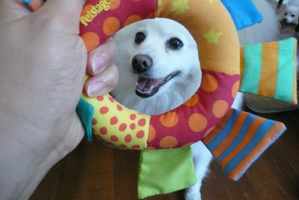 最近、羽衣ちゃんの笑顔が撮れなかったのですが、久々の1ショット~ おもちゃ越しの良い笑顔が撮れましたあ、右上に眠そうな風ちゃん写ってる~