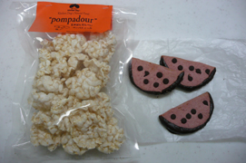 25日夕方、実家から戻ってきました。なんだか、こちらの駅に降り立って、 「ほっ。」 としている自分が居て、すっかりこちらに馴染んでいることに改めて気付いちゃいました。 家に戻ったら、3ワンが熱烈大歓迎暫くは自由にさせてもらえず、顔と手を舐めまくられましたが、お土産のおやつをあげると、あっという間に解散して、それぞれの陣地で一心不乱にむさぼりついてましたぁ 左はポン菓子、右はスイカのかたちのクッキー♪ 動画を撮ろうの思ったのに、あっという間で撮れず。まだ残ってるから、またチャレンジしてみます 今回の帰省では、編み物の材料や、掘り出し物のお買い物もしました。また、実家の母からはお土産もね。ありがたい親心です。宅急便で送ったから、今日の夜到着予定。届いたら、画像UPしま~す