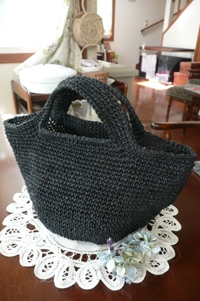 お盆前から少しづつ編んでいた、麻ひもバッグが出来上がりました~~ 今回は黒の麻紐で編んだのですが、すごく固めの紐だったので、指が痛くなっちゃいましたもうこの紐では編みたくないかも でも、大変だった分、かなり気に入りましたけど