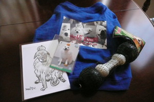 こんにちは、ボク、風です。みなさん、風邪コンコンしていませんかボクはとっても元気で快腸だねって、ういそらふう。ママに言われます あのね、今日はたろーおにいちゃんが遊びに来てくれたんだ。たろーおにいちゃんのママの あつみちゃん が、たくさんお土産を持ってきてくれたよ おもちゃと、たろーおにいちゃんのTシャツと、ポストカード&クオカード! あつみちゃんは、とってもお写真撮るのが上手で、たろーおにいちゃんをモデルに撮ったお写真が、ムツゴロウさんのお目にとまったんだってそれで、ご褒美にそのお写真のたろーおにいちゃんの似顔絵と、クオカードっていうのを作ってくれたんだって でも、似顔絵はママが 「 びみょうだね 」 って言ってたよ。 あつみちゃん、着てみたよ!似合うかな~? えへへ♪ カッコイイかな? あつみちゃんは、たろーおにいちゃんをモデルに、ポストカードや雑貨 を作ってるんだよ。このTシャツは、その宣伝隊用なんだって。ボク、これであつみちゃんとたろーおにいちゃんを応援するねでも、せっかく久しぶりにたろーおにいちゃんと会ったのに、ボクは羽衣ママや宇宙ちゃんを守らなきゃだから、ついつい男の子のたろーおにいちゃんにガウガウしちゃったの。たろーおにいちゃん、ごめんね でも、また遊びにきてね