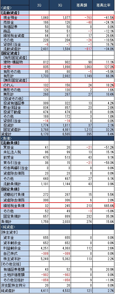 ポイントとしては、現金が7.6億減っていて、土地が10億増えていて、のれんが2400万発生していて、繰延税金負債が2億発生しているところ。