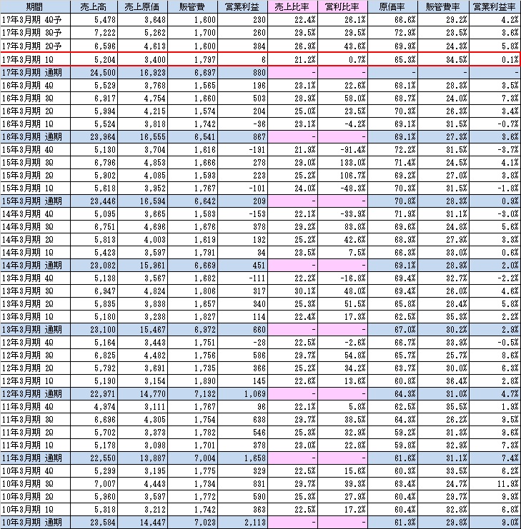原価率の改善は主にこのセグメントにかかっていると思われ、前期比で減収かつ恐らく販管費は大きく変わらないであろう中で、セグメント利益が改善している点は評価できなくもないが、黒字定着出来なかった点はマイナス。