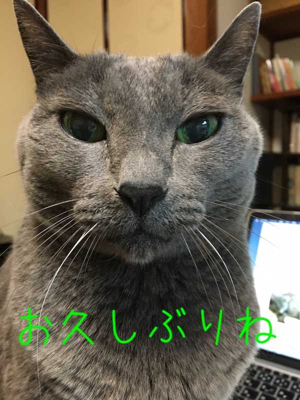 残暑お見舞い申し上げます。有喜庵です。うっきー先生はご機嫌斜めです。青猫先生:「2か月前にウチに新入りが来たのよ。」青猫先生:「ミミーだか何だか知らないけど、この子がほんと行儀を知らないのよ。」「この間なんか、私に飛び蹴りを喰らわせたのよ シャーッと叱ってやったわ」新入りミミー:「蹴ってにゃい。ぴょんとしたらあたった。」うっきー先生と新入りミミーの対立は2か月後の現在も続いております。しもべ1号2号共に、2匹に翻弄される毎日です。(o´Д`)=зそして傷だらけのしもべ1号