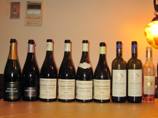 上野をぶらぶら、銀座をぶらぶら、渋谷をぶらぶら、そしてワイン会に突入。今日は白ワイン中心で気軽に飲もうという企画です。 ギイ・アミオのクレマンの第一印象は、"意外にいいじゃない"・・て感じでしたが、その後にアンドレ・ロジェを飲むと、やはり違います。ロジェの方が甘味や旨味があり、まろやかで上品な味わいで、格が一段違いました。 ギイ・アミオの白4種を良かった順に順番を付けるとすれば、ドモワゼル>カイユレ01>カイユレ02/マシェレル02。ドモワゼルはモンラッシェ、シュヴァリエ・モンラッシェに隣接する素晴しい立地にあるだけあり、シャサーニュ各銘柄より深みがあり、当然ながら一番でした。 リンシエメはいずれも濃厚で、タンニンも滑らか。なかなか美味しいです。2本を同時に並べて飲んでいないので、完全には比較しにくいのですが、01の方が締まった感じで、一段上の評価です。 最後のデザートワインもなかなかのもので、ソーテルヌ物にも引けをとらないくらいに感じました。 Nさん、皆さん、今日も有難うございました。Amiot Guy Cremant de Bourgogne NVAndre Roger Grand Cru Vieilles Vignes Brut NVAmiot Guy Chassagne-Montrachet 1er Cru Les Macherelles 2002Amiot Guy Chassagne-Montrachet 1er Cru Les Caillerets 2002Amiot Guy Chassagne-Montrachet 1er Cru Les Caillerets 2001Amiot Guy Puligny-Montrachet 1er Cru Les Demoiselles 2005Giovanni Corino l'Insieme 2000Giovanni Corino l'Insieme 2001Santa Barbara Winery Late Harvest Sauvignon Blanc 2001