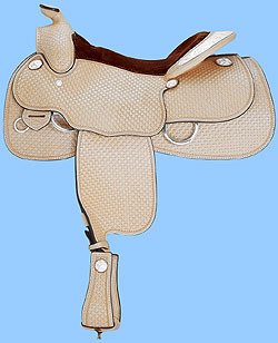 放牧中でもほとんど動かないダニーを運動させるため午前中は、ニューサドルの試乗を兼ねてウォークで蹄跡をぐるぐる回った。左回りだと問題なく普段あまり見せないやる気を見せてサクサクと歩くのだが、右回りにした途端動きがぎこちなくなる。途中、肢の状態をみるため一度だけジョグにしたのだが、やっぱり少し首を振って痛そうにしていた。ただ、あまり休ませすぎても良くないと思うので、その後もしばらく蹄跡を歩かせた。サドルを見せびらかす意味もあったのだが。。。午後。ウォークからジョグにするとやっぱり首を振る。ウォークの状態でビッコになったらやり過ぎかもしれないが、今日はちょっと痛くても少し動かしてやるつもりだったのでそのまま続行。ジョグでは馬のフレームを気にしながら乗ってたのだが、同じ馬場で乗ってた先生に「フレームよりもっと肢を前に出させるように」と言われた。で、フレームを気にするのは中止してジョグのスピードをちょっと上げて、馬を動かすことに集中するようにした。左右のサークルでしばらく動かしていたら、ほぐれてきたのか首の振りもなくなってきた。ロープでも軽いロープには遠いけれど、痛そうに走っている感じはしない。フレームはいいからといっても気になるので、わざと右は大き目のサークルにして左は小さいサークルにした。アドバイスの意味は聞かなかったが、動けない状態でフレームを気にしてもしようが無いってことなんだろう。ウォーク、ジョグ、ロープと一通りの歩様はやったけど、結局全部ウォーミングアップだったような気がする。ロープまでやって体がほぐれたところで、ジョグに落としてフレームをちょっといじってみるのがいいかもしれない。今まで借りていたサドルが15.5インチでニューサドルが16インチ、1/2インチの差じゃ対して違わないかと思っていたら、全然違った。いままでお尻がキャントルに常に当たっていたのが、後ろに余裕があるように感じられる。またシートの前の部分が若干低いので、その分だけ骨盤が立って背筋が伸びた気がする。ブルーリボンのサドルはもともとプレジャーサドルなので、借りていたレイニングサドルに比べるとフェンダーが少し後ろ気味に感じられる。ただ革が柔らかいので前に出すのはそれほど苦にならない。今のところいまいちだと思うのは鐙。鐙がまだ前を向いてないので、強制的につま先が内側に向けられる。その状態で乗ってると膝にくるが、これも竿でも鐙に通してくせをつけてやれば問題ないと思う。もう一点、鐙が厚いというのか広いというのか、ブーツの土踏まずに当たる部分が広すぎ。これも慣れの問題なのかもしれないが、奥まで足を入れると踵が鐙にかかって自動的に踵が上がった状態になってしまう。しばらく使ってどうしても慣れなかったら鐙だけ交換するかも。フェンダーが後ろ気味に感じるのも、骨盤が立った分だけ足が後ろに行っているとか、鐙に踵がかかっているとかでそう感じるのかもしれない。しばらく乗って馴染んでくれば、なんの問題もなくなるのかもしれない。今考えれば、$4,000以上のサドルを通販で買うなんて無茶な冒険だったかもしれないが、全体としては非常に満足。サドルにいくらかかるという事は考えていたのだが、ショーの費用を全く考えていなかったことに気づいた。これからショーの費用をどこかから捻出しないと。。。