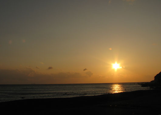 岬の家にいると「時間」と「季節」を強く意識します。大阪のオフィスでは就業時間になっても外が明るいので「日が長くなったねぇ。」と思うことはありますが季節はデパートのディスプレイを見て感じます(笑)ビルで四角く切り取られた空を見上げることもあんまりないです。これは12月。煙樹ヶ浜からみた岬です。太陽は海に沈みます。家から見るとちょうど岬の先端あたりに沈むようにみえてました。これは2月ぐらい。先端からかなり中よりに沈んでいます。暖かくなってきてもやのある空が多くなってきました。これは4月。岬の上にあるホテルからさらに山側に沈むようになりました。日が長くなったのが感じられて、外で活動する時間がぐ~んと増えました。最近は家の前の道から正面にみえる山の稜線に沈みます。こうやっておひさまが動いて季節が進んでいくことを意識できるゆとりが岬にはある気がします。もうすぐ夏至です。おひさまはまた海に向かって移動していきます。岬での海辺暮らしも半年すぎました。にぎやかな夏はもうすぐです。ブログ村ランキング 海辺の暮らしよかったら、ポちっと押してくださるとうれしいです