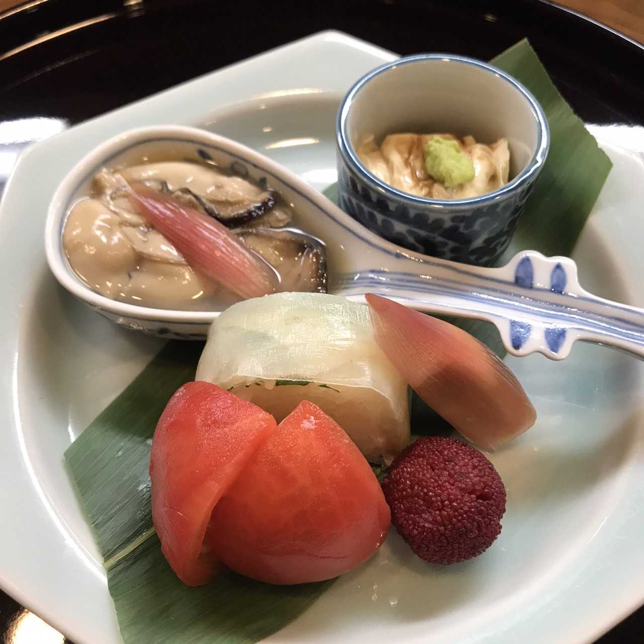 牡蠣 生湯葉 寿司 茗荷とクリームチーズ フルーツトマト 山桃