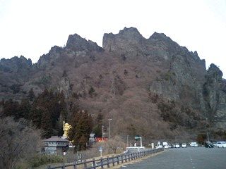 昨日は妙義山に遊びに行ってきました。カメラも携帯も忘れるという大失態をおかした私。ダンナさんが携帯で写した数枚の写真しかないのですが、どうかお付き合いください。山頂(車でいける一番上)の中之嶽神社の駐車場からの風景。シーズンオフなのか、とても空いています。中央部分下に何やら奇妙な物体が・・・正体はこれ日本一の大黒様だそうで。何だか、やっちゃった~、って感じですが。野球少年がたくさん来てましたが、こんなお守りを発見して納得。中之嶽神社の前の石段を駆け上がってました。私とダンナさんは日ごろの運動不足が祟ってゼーゼーしながら上がりました。疲れすぎて轟岩の写真を撮り忘れる始末。今度行った時は必ず撮りたいと思います。中之嶽神社より下ったところに妙義神社があります。台風の土砂崩れの影響で、上の本殿に行くことが出来ませんでした。よく見ると工事の看板が・・・。本当ならこんな景色が見れたはずなんですが、復旧工事が終わったら、是非来たいと思います。今日のオマケ。妙義神社の手水舎。ビシビシ凍ってます。ここには龍はいないのかな~、と思ったらいた。巻きついておりました。