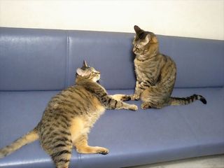 ニャンコ達の人気スポットは、エアコンの下の長椅子の上。暖かくて眠くなっちゃうねぇ。変な子がいる?気にしないでください、福なんで。