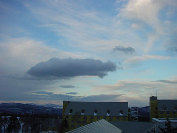 ここはエンターティメントなスキー場ではちょいと有名な安比APPIスキー場Ureさんは3年前に右膝の十字じん帯を切っているので今回もホテルの部屋で待機組です。暇なので窓から空を見てます。一緒に部屋にいる姪に声をかけました。「ミカコ~、なんか黒い雲が泳いできたよ~」『ほんとだ~、巨大魚みたい~』Ureさん「あの後ろにくっついてるのを今から消してみせるね!』ミカコ「ハァ~ィ………」そしていきなり!「おおう!」消えた!黒い雲の流れが以上に早かったんですね。目に見えない地球を取り巻く大気の…気流の流れを味わったひとときでした。この人間はちいさいけれどイメージは宇宙の果て迄飛んでいける…のが面白いね!