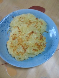 今日の1品はこれ簡単です。最近はこう君のお手伝いが増えましたジャガイモの皮をむき、スライサーで千切りにします(なければ包丁で)塩コショウを振り、混ぜますしばらく置いておくとジャガイモの水分が出てきますこの水分にでんぷんがありこれのおかげでつなぎを使わずに焼けますお箸でつまんで並べてフライ返しでなんとなく形を整えるだけです両面焼けば出来上がりこれにミンチを混ぜると夕飯のメインになります鮭フレークを混ぜるとお弁当にも綺麗です(鮭フレークと混ぜる時は、塩コショウを少なめで)今回はダイエット弁当なのでなし~今日は他に、もやしの胡麻和えサラダ蒸しキャベツとハムのロールまき(これ、飾りにきれいだよ~)チーズコーンなすと豚肉の黒酢炒め薄焼き卵のお花飾りこう君にはなすが無くて、ソーセージを追加ダイエット弁当なのでお肉は脂の少ない物油はゴマ油、砂糖は蜂蜜で冷凍食品なしなのは辛いけどこう君と2人分で30分もあれば出来ました完成写真はすっかり忘れましたこう君のはニコニコ顔付きのご飯にしたのに~。私の独身時代のネコちゃんのお弁当箱が良かったらしく可愛いのを持って行きました(^_^;)卵のお花も飾りに入れてるし・・・やっぱり女の子チックなお弁当となりました