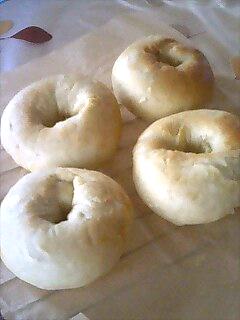 リクエストにより載せま~す発酵なしなので簡単です材料豆腐(絹・木綿どちらでも) 200g 強力粉 200g 砂糖大さじ1塩 小さじ1 ドライイースト 小さじ1弱ゆで用砂糖又は蜂蜜 大さじ1お豆腐は水切りをしておきます強力粉をボウルの中で山の形に入れます真ん中をへこまして砂糖、Dイーストを入れます周りの所に塩を入れます(一緒にすると発酵しにくくなるので)豆腐を2分程度レンジで温めます(人肌よりほんのり温かく) ※これによって軽く発酵するので必ずやってね やけどに注意!温めた豆腐を粉の中心に置いて、真ん中からこねますひとまとまりになるまで10分程度こねたら10分、休ませます(まとまらなかったら粉を足す)4等分します細長い棒状にして片端だけつぶします(カキ氷のスプーン状)つぶしたところで反対の端を包んでしっかり閉じます穴に指を入れてくるくる~と(笑)少し穴を広げておかないとつぶれます形が出来たら10分ほど休ませますその間にフライパンにお湯を張る(お砂糖を溶かす)オーブンを200度に余熱(余熱時間がかかるオーブンはもっと早めに)フライパンのお湯が小さなぷつぷつが出来る程度の沸きぐあいになったら投入(グラグラさせると表面がはがれるので注意)全部をほぼ同時に(大急ぎよ~)片面30秒ずつ出来たら天板に乗せてすぐに!オーブンへ※すぐにしないとしわしわになるよオーブンで18分焼きます出来上がり♪最後はバタバタだけど、早く出来上がって楽しいよ♪