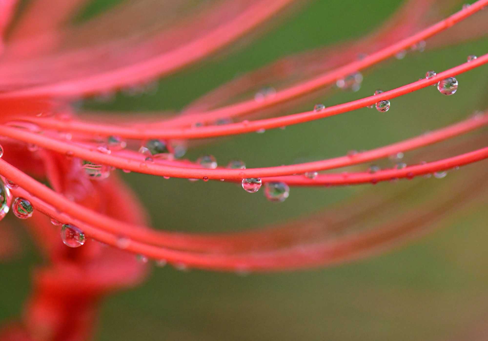 庭の雨上がりの彼岸花です。白花がないので、赤いのだけでさびしいですが。( ;∀;)あとは鍾馗水仙が出てくるのを待つばかりとなりました。ころんころんが楽しい。水滴の中に彼岸花が。細いしべには小さい水滴。大きな水滴、小さな水滴。かがんで動かないようにして撮っていると、蚊のえじきにされます。( ;∀;)同じような構図でも、露出をかえたり絞りを変えたりして撮ったりしています。水滴をまとうと、普段目にする彼岸花とは違う世界みたいですね。('◇')ゞ