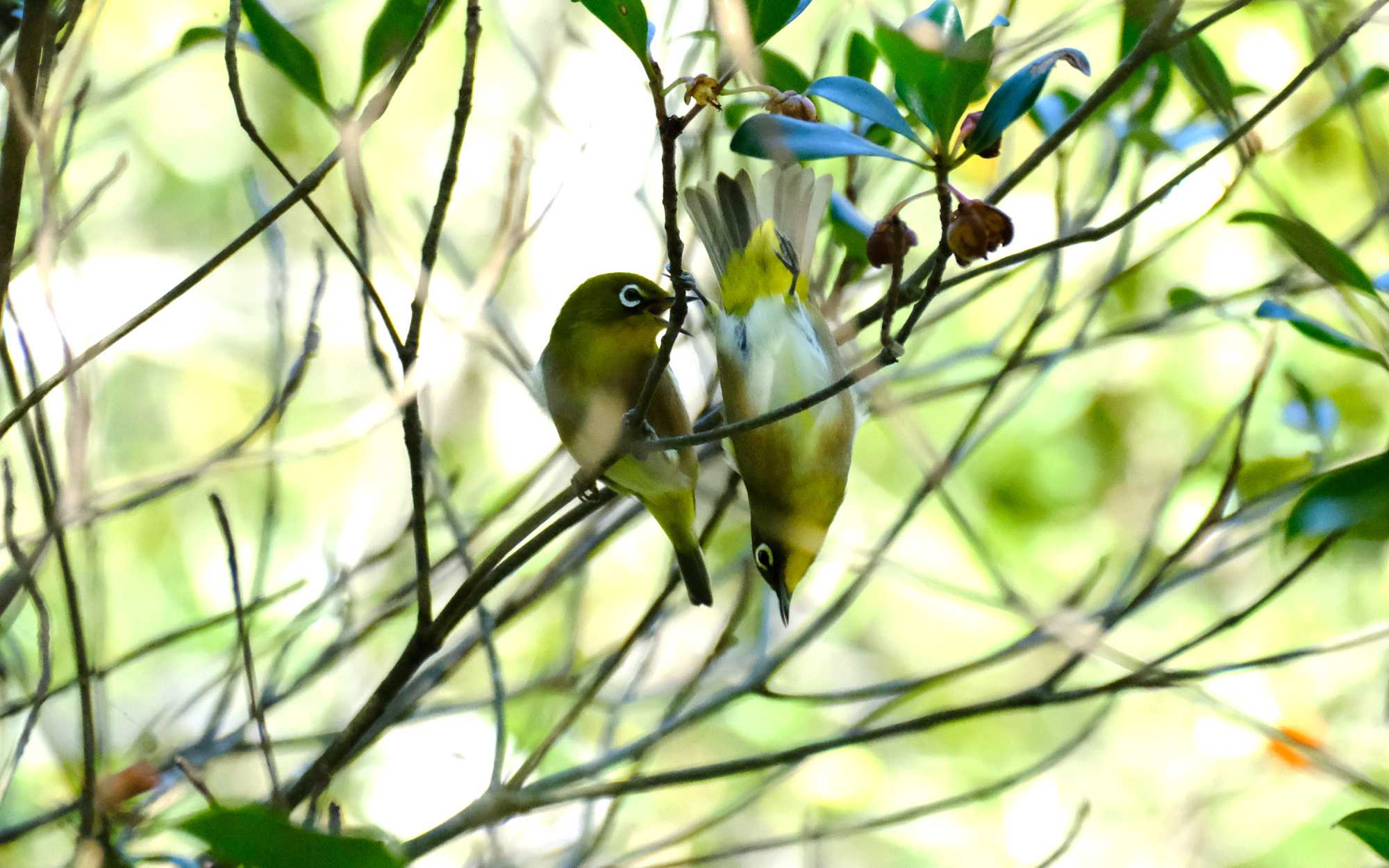 やっとメジロも見かけるようになりました。今の時期ですと、小さな木の実のなっているところや柿などに来るようです。モッコクの実のところで見かけました。モッコクの中に二羽のメジロを見つけました。声はすれどもで、緑の中ではメジロは見つけにくかったです。('◇')ゞあらら、一羽はまっさかさまに。もう一羽も羽をひろげて。ほかにもメジロがいるようです。そのメジロの目的は、これ。モッコクの実です。うーん、どうやって食べようかな。実の割れたところから、果肉や種を食べるらしいです。ふわりと降ります。下からもあがってきます。どのメジロも、なんだかやたらと動きが速く落ち着きません。最後は二羽並んで急降下?